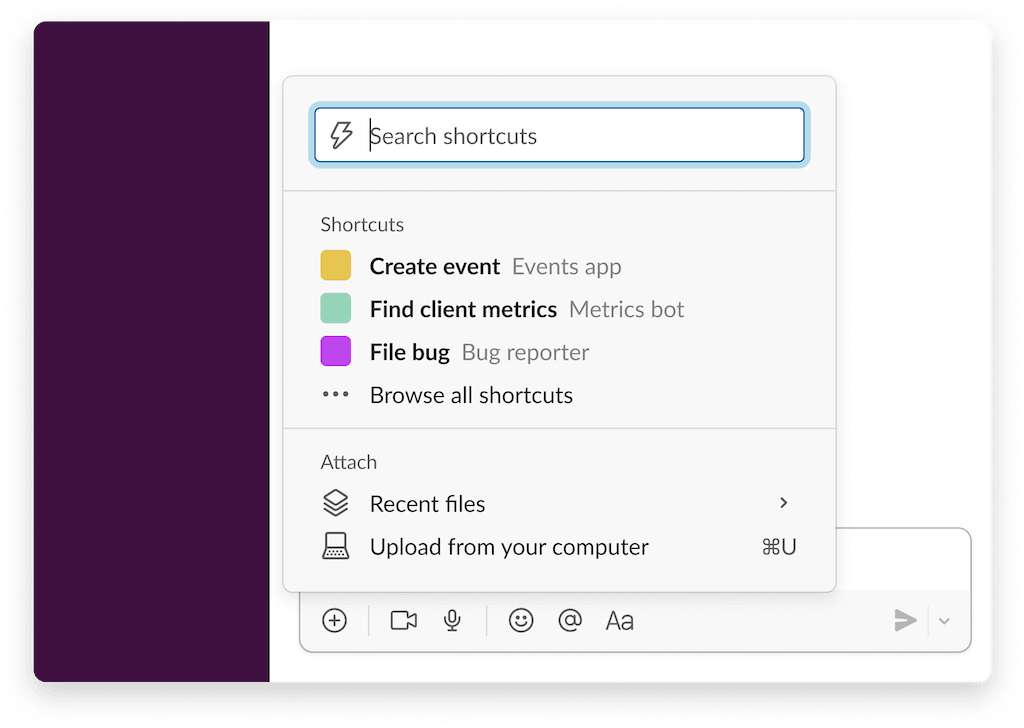 Shortcuts let users quickly trigger workflows from various prominent locations within Slack.