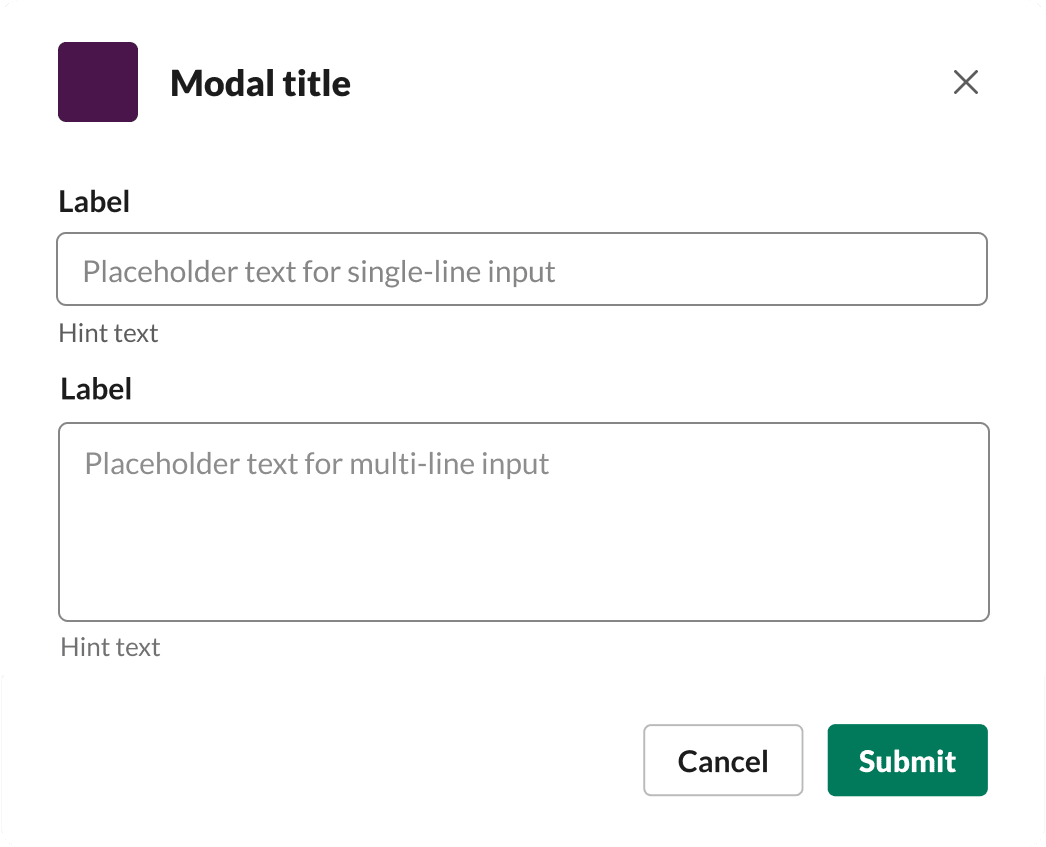 A modal is the Slack app equivalent of an alert box, pop-up, or dialog box. Modals capture and maintain focus within Slack until the user submits or dismisses the modal. This makes them a powerful piece of app functionality for engaging with users. Modals are available for both Bolt apps and Deno Slack SDK apps.